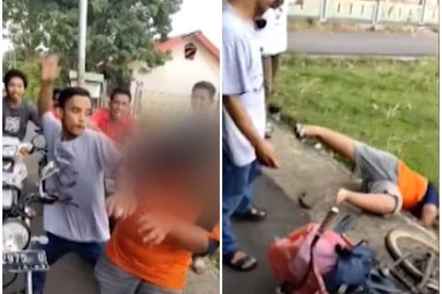 Bahkan salah satu dari pemuda tersebut terlihat memukul dan mendorong Rizal hingga jatuh tersungkur.